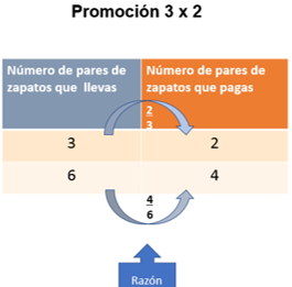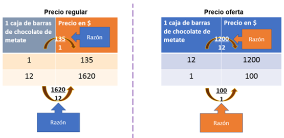 De esa forma, se establecen dos razones para cada situación. En ellas se compara la cantidad de cajas con su precio en ambas situaciones, la del precio normal y la del precio de oferta.
