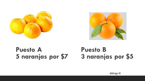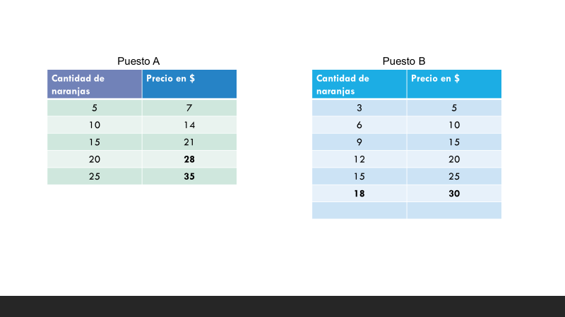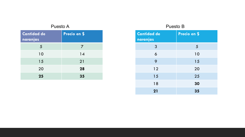 Ahora, considera las cantidades y precios que ofrecen estos dos puestos, tomando como referente una cierta cantidad de dinero que hay para comprar naranjas.