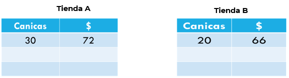 Los datos son: en la primera tienda le dan 30 canicas por 72 pesos y en la segunda tienda 20 canicas por 66 pesos.