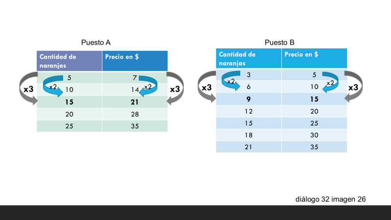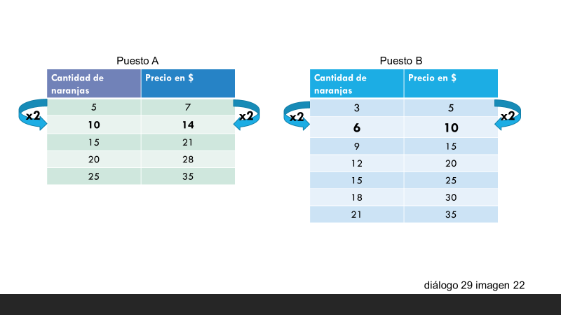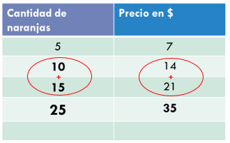 Como observas en ambas tablas, se puede obtener la cantidad de naranjas y su precio, si se duplican los valores iniciales.