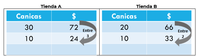 Estoy ahorrando para comprarme unas canicas, no importa la cantidad que compre sino donde obtengo un mejor precio. En una tienda tienen la oferta de 30 canicas por $72 y en otra me venden 20 por $66 |