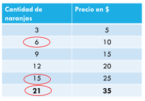 Y por cada 7 pesos más, puedes adquirir un montón de 5 naranjas más. Si sigues aumentando de 7 en 7 llegarás a darte cuenta de que con 35 pesos se compran 25 naranjas y, equivale a 5 montones de 5 naranjas por 7 pesos.