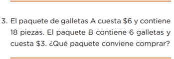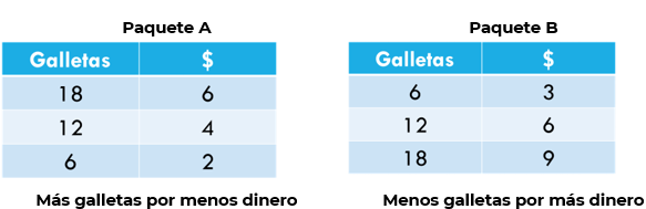 Observa, en uno te dan el triple de galletas por el doble de precio, entonces te conviene comprar las galletas del paquete A, ya que te dan más galletas, pues triplican el contenido, pero no triplican el precio.