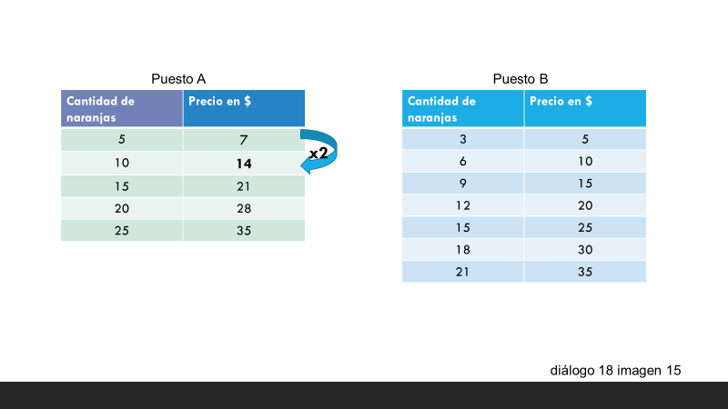 Una manera de determinar en qué puesto conviene comprar las naranjas es comparar el costo, cuando se logra igualar el número de naranjas en ambos puestos. Las tablas permiten identificar que, la primera cantidad de naranjas que coincide, en ambos puestos, es 15.