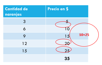 Y si sumas los valores correspondientes en la columna de cantidad de naranjas, 10 y 15