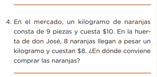 En el mercado, un kilogramo de naranjas son 9 piezas y cuesta $10 en la huerta de don José 8 naranjas llegan a pesar un kilogramo y cuestan $8 ¿En dónde conviene comprar las naranjas?