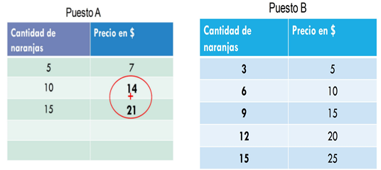 En la tabla se observa que en el puesto A por 21 pesos se compran 15 naranjas y, en el puesto B, se requieren 25 pesos para comprar 15 naranjas.