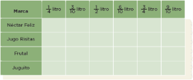 Además se observa que en la publicidad está escrita con números decimales la cantidad de jugo de cada presentación y en la tabla está puesta como fracciones comunes, entonces ¿Cómo se va a hacer?