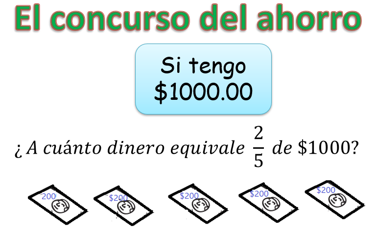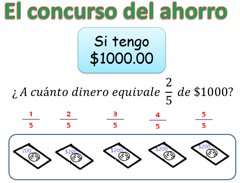 Si ahora tienes $1000.00 pesos, ¿A cuánto dinero equivale dos quintas partes de mil pesos? Primero divide los $1000.00 entre 5 y cada quinta parte, es decir, un quinto equivale a $200.00 y los dos quintos es igual a $400.00 y al ver la representación gráfica comprueba lo que realizaste de manera mental.