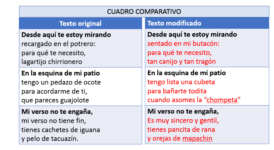Observa el siguiente cuadro comparativo y lee a ritmo de una bomba yucateca los ejemplos de texto original y texto modificado.