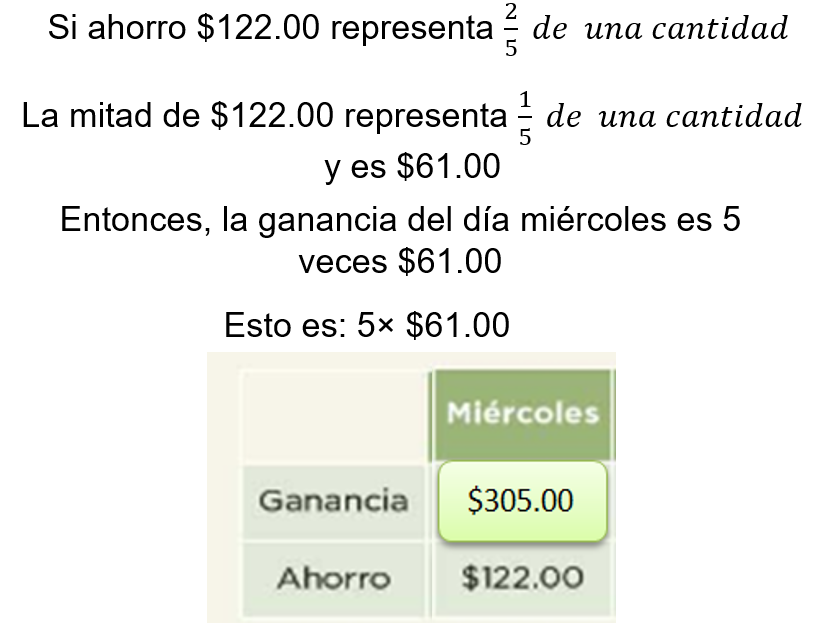 Parece un poco complicado, porque ahora debes determinar cuánto dinero es de ganancia. Observa, no tienes el monto total de la ganancia, pero conoces el ahorro y sabes que éste representa dos quintas partes, entonces, la mitad de ciento veintidós pesos representa un quinto de la cantidad total, así que si multiplicas por cinco esa cantidad tendrás la ganancia del miércoles, que corresponde a $305 pesos.