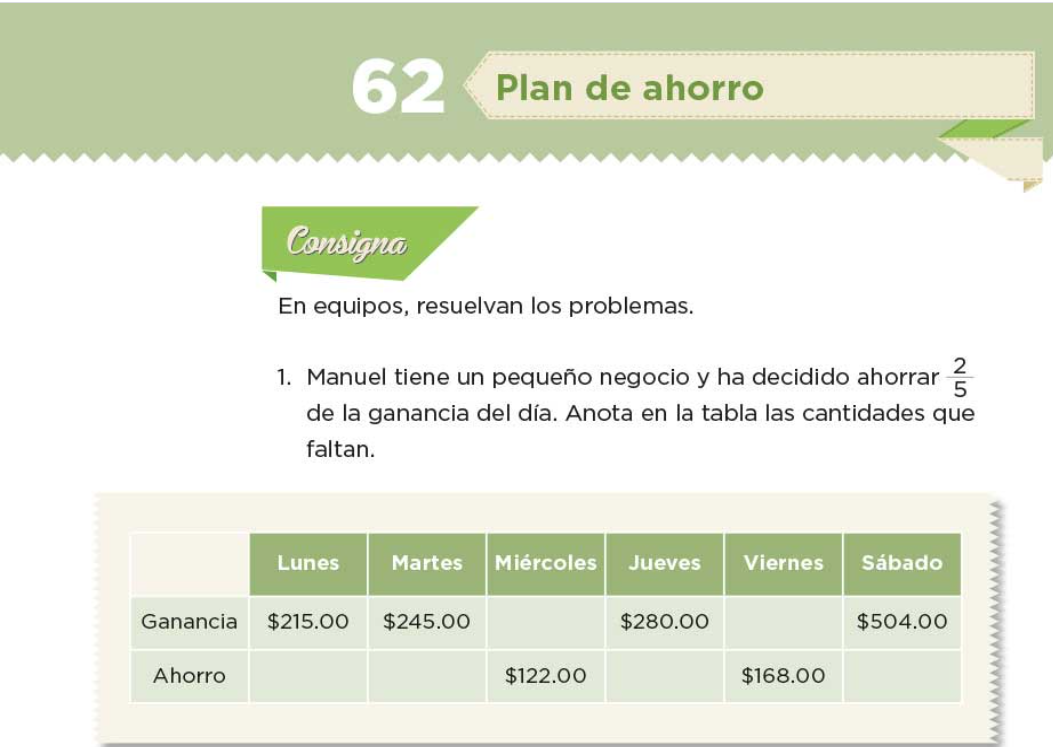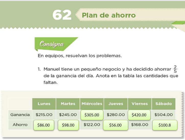 - Manuel tiene un pequeño negocio y ha decidido ahorrar dos quintos de la ganancia del día. Anota en la tabla las cantidades que faltan.