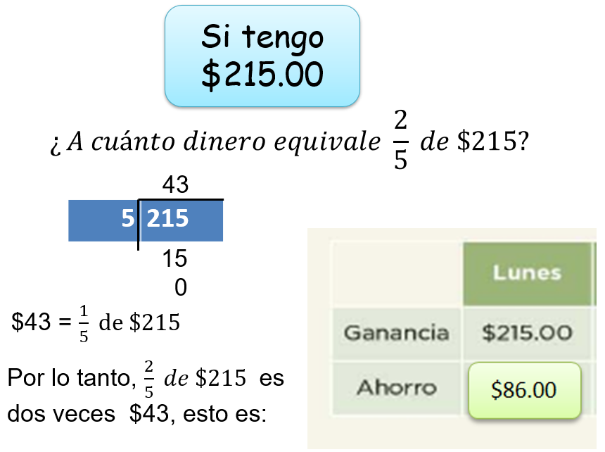 Comienza con el día lunes. En ese caso, puedes primero dividir $215 entre 5 y el resultado es $43 esto es una quinta parte, así que después suma $43 dos veces, entonces el resultado total es $86 pesos de ahorro del día lunes.