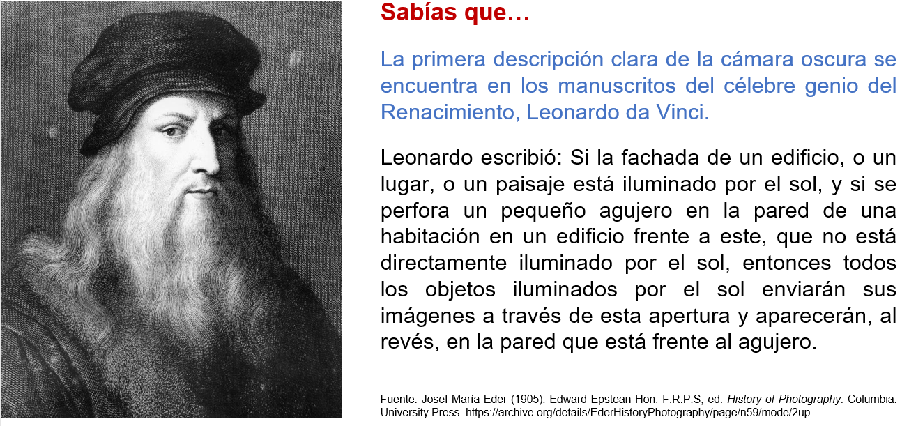 ¿Quién lo inventó o descubrió? Ese fenómeno era ya conocido en la Antigüedad por Aristóteles y Euclides, y en la Edad Media, por Alhacén y Roger Bacon, de quienes ya hablamos, pero fue Leonardo da Vinci quien lo interpretó y estudió a fondo. Como se menciona en el siguiente Sabías que…