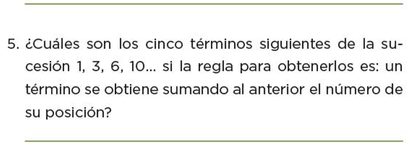 Observa, ya te dieron los primeros 4 términos de la sucesión y piden que encuentres los 5 que siguen con una regla especial que consiste en sumar al número anterior, el número de la posición del que vas a escribir.