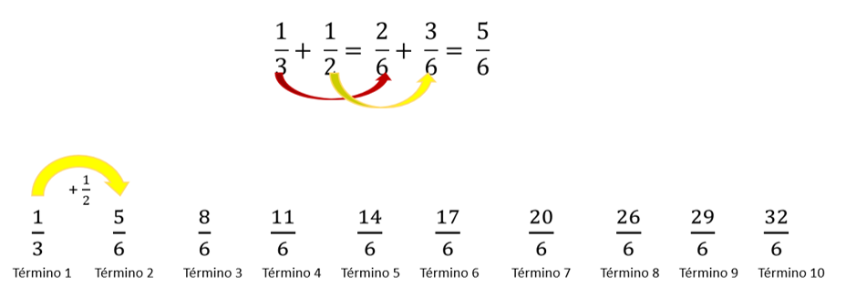 Una vez que ya se tiene el mismo denominador, la suma es mucho más sencilla. El primer término de la sucesión sería un tercio o podrías poner también dos sextos, pues representan la misma cantidad. ¿Cuál sería el segundo término?