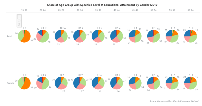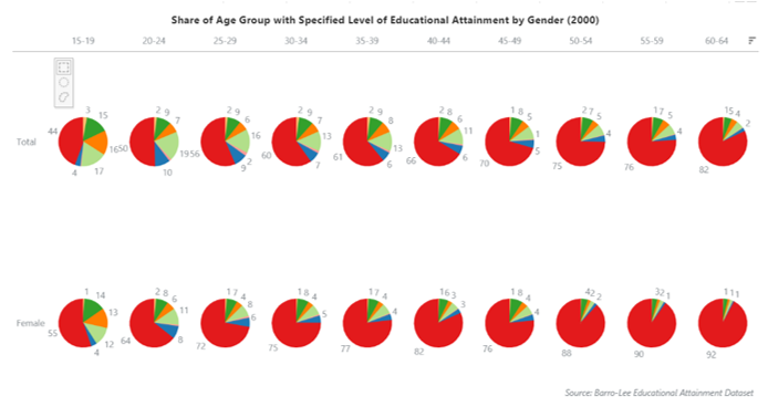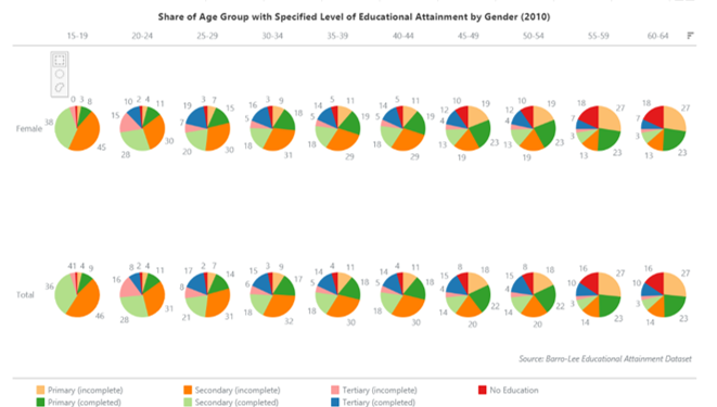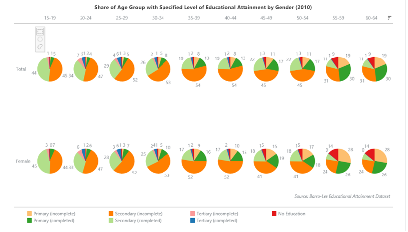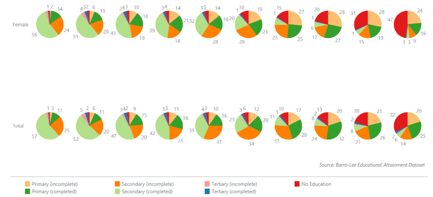 Observa que lamentablemente predomina el color rojo pero esta gráfica corresponde al 2000 ahora observa otra gráfica del año 2010 observar que, si bien todavía se ve el color rojo, también ha disminuido, lo que refleja que se han proporcionado mayores oportunidades para que las mujeres puedan acceder a otros niveles educativos, también en Pakistán.