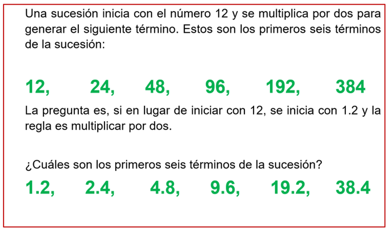 La sucesión se inicia con el número 12 y se multiplica por dos para generar el siguiente término. Puedes observar que cada término va aumentando el doble del anterior. Los primeros seis términos de la sucesión, son: doce, veinticuatro, cuarenta y ocho, noventa y seis, ciento noventa y dos, trescientos ochenta y cuatro. La pregunta es, si en lugar de iniciar con 12 se inicia con 1.2 y la regla es multiplicar por dos. ¿Cuáles son los primeros seis términos de la sucesión?