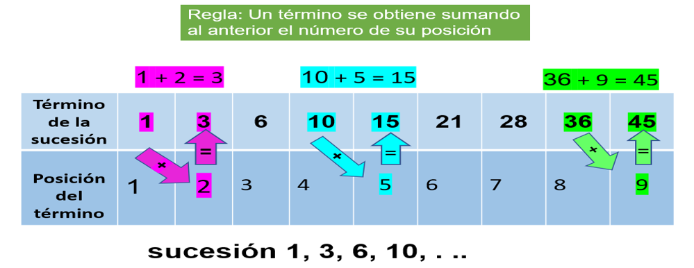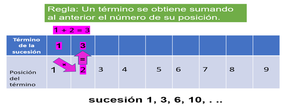 Aplicando la regla: “Un término se obtiene sumando al anterior, el número de su posición”. Vas a identificar los términos de la sucesión, son: 1, 3, 6 y 10 enseguida, identifica su posición 1, 2, 3 y 4