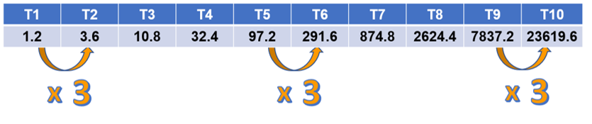 Parte de uno punto dos y este número se multiplica por tres, así obtienes el segundo término que es 3.6, ahora vuelve a multiplicar por 3 y da 10.8, otra vez por 3 y da 32.4, otra vez por 3 y da 97.2, otra vez por 3 y da 291.6, otra vez por 3 y da 874.8, otra vez por 3 y da 2624.4, otra vez por 3 y da 7873.2, otra vez por 3 y el décimo término es 23619.6