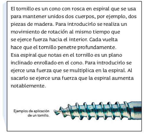 La espiral del tornillo es un plano inclinado enrollado y, al girar, se va introduciendo con menos esfuerzo.