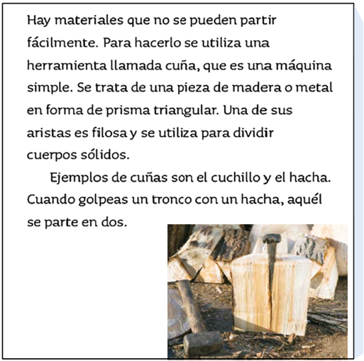 Haber leído este texto sirvió para recordar lo que es una cuña y algunos ejemplos. Te diste cuenta de que la forma afilada de esta máquina simple es la que hace más fácil partir una manzana, un tronco o hasta una piedra.