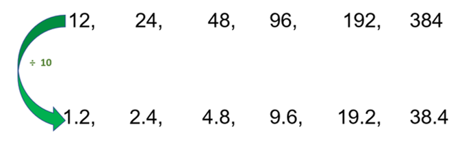 Entonces el primer término será 1.2 pero tendrás que multiplicarlo por 2 para obtener el segundo término que es 2.4, el tercer término es 4.8, ¿Qué curioso? En la primera sucesión tenemos 12, 24 y 48 en la segunda sucesión están 1.2, 2.4 y 4.8, son las mismas cifras que en la primera sucesión, pero el punto decimal está entre ambas cifras.