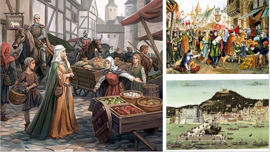 Durante el siglo XII en las ciudades medievales se comienza a comerciar con el excedente de la agricultura y con productos obtenidos de diversas rutas comerciales, también empezaron a surgir talleres artesanales y los artesanos empezaron a organizarse en gremios. Estos gremios establecían que hubiera maestros y aprendices de un oficio, se agrupaban en las mismas calles y fijaban el precio y calidad de sus productos.
