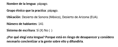 Como recordarás, primero se hizo una ficha en la que se incluyó la lengua seleccionada, algunos datos, argumentado por qué se eligió.