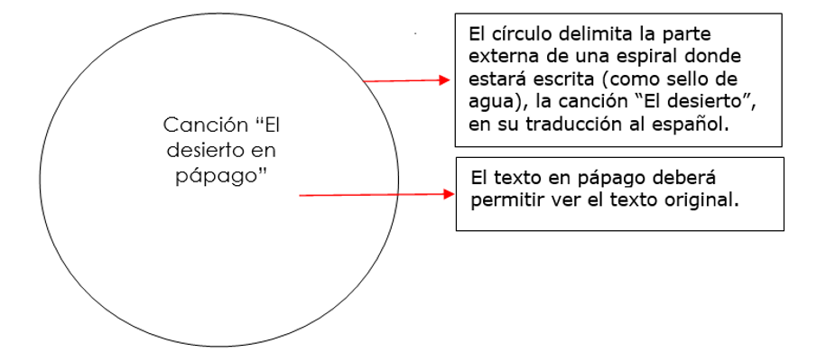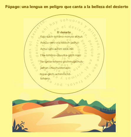 Así fue como se mostró en el esquema-boceto de la semana pasada, pero luego se modificó para que el texto en pápago aparezca como sello de agua y lo que más resalte sea la traducción al español. No obstante, si lo que se desea promover es el pápago, entonces debe ser al contrario, resaltar la lengua pápago y en sello de agua la traducción al español.