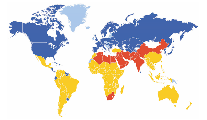 Llama la atención que también es en estas regiones donde se encuentran algunos de los grandes ríos mencionados anteriormente como el Amazonas, en Brasil, y el río Amarillo, en China, y a pesar de ello, su población sufre por la falta de agua, por último, en color rojo están los países que, lamentablemente, tienen muy, pero muy poca agua, donde casi no llueve, su paisaje es desértico y la población, así como las plantas y animales, sufren y aguantan sequías que duran varios meses o años. En esta condición están los países del norte de África como Argelia y Libia y, los del suroeste de Asia como Arabia Saudita, Irak e Irán, entre otros.