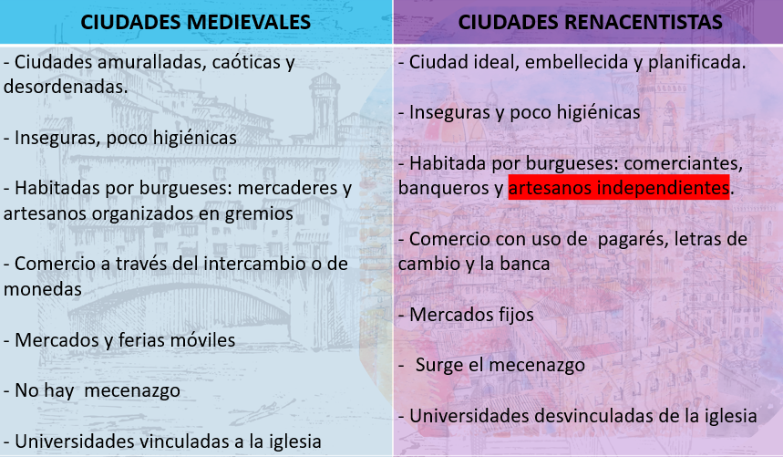 Presenta el cuadro comparativo de las ciudades medievales y renacentistas a algún familiar cercano y explícale las diferencias que había entre las características de unas y otras ciudades, seguro le será muy interesante.