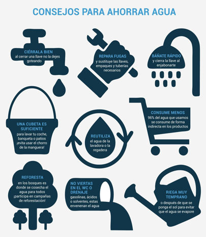¿Qué puedes hacer para cuidar tu consumo de agua? Las acciones son muy sencillas, pero importantes. Las medidas son: cerrar bien las llaves y no dejar que goteen; reparar las fugas de agua; bañarse rápidamente; reutilizar el agua de la lavadora o la regadera.