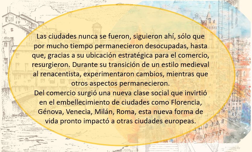 Con lo que ya conociste, puedes concluir que el comercio fue el detonante del resurgimiento de la vida urbana, las ciudades nunca se fueron, siguieron ahí. Solo que por mucho tiempo permanecieron desocupadas, hasta que, gracias a su ubicación estratégica para el comercio, resurgieron. Durante su transición de un estilo de vida medieval a otro renacentista, experimentaron cambios mientras que otros aspectos permanecieron.
