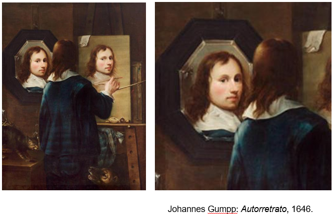 Mira con atención, ¿Qué identificas? Observa que en la primera imagen, el artista se pinta de espaldas, pinta su reflejo que ve en el espejo y que, al parecer, le ayuda para pintar su autorretrato. Reconoce como los espejos son utilizados en el arte, como la pintura.