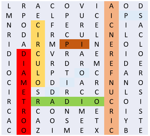 Ya solo faltan dos. Busca y encierra la palabra “círculo”. Ya la que falta es una palabra de dos letras. Recuerda que tiene que ver con el círculo y la circunferencia, es la palabra “Pi”.