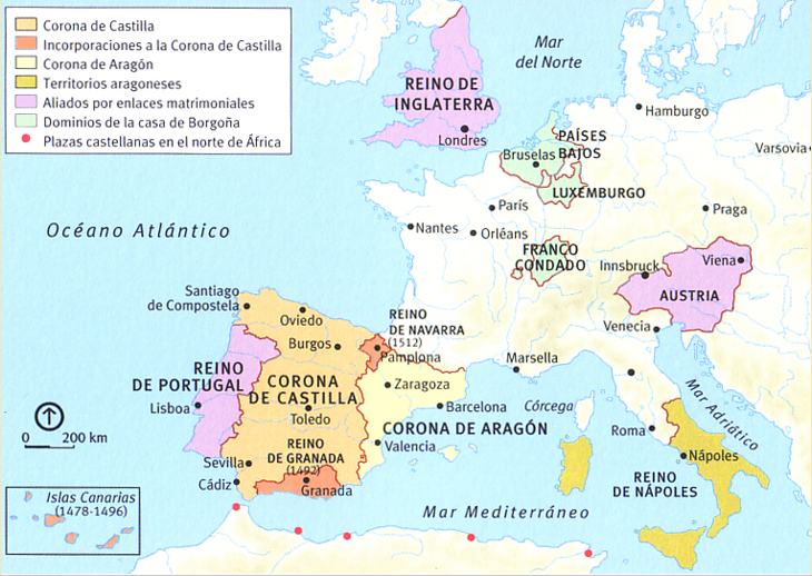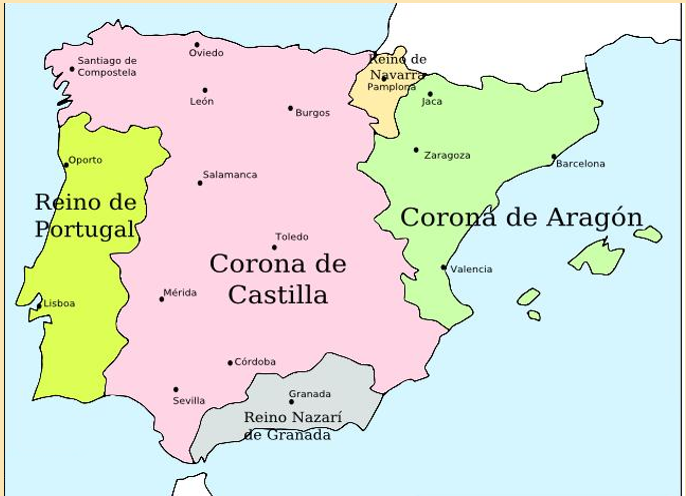 Desde la segunda mitad del siglo XIV, es decir, por ahí del año de 1360 lo que actualmente es la península ibérica estaba dividida en varios reinos distintos: el reino de Portugal, la Corona de Castilla, la Corona de Aragón, el reino de Navarra y el reino de Granada, este último gobernado por musulmanes. Pues bien, resulta que en el año 1469 el príncipe Fernando de la Corona de Aragón y la princesa Isabel de la Corona de Castilla se casaron. Gracias a este matrimonio, ambas coronas comenzaron un proceso de paulatina unificación y expansión