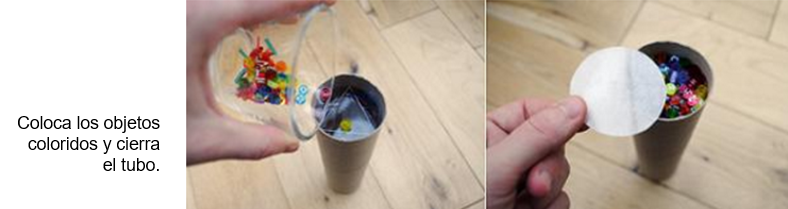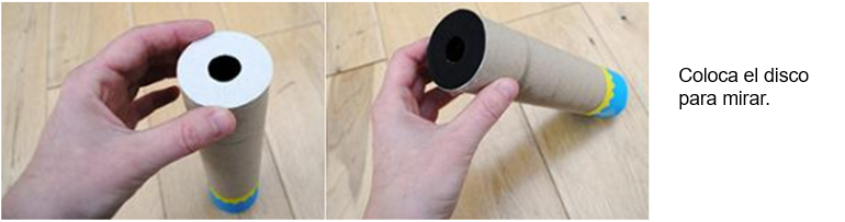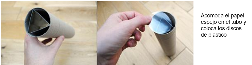- Acomoda el papel espejo en el tubo y coloca los discos de plástico.