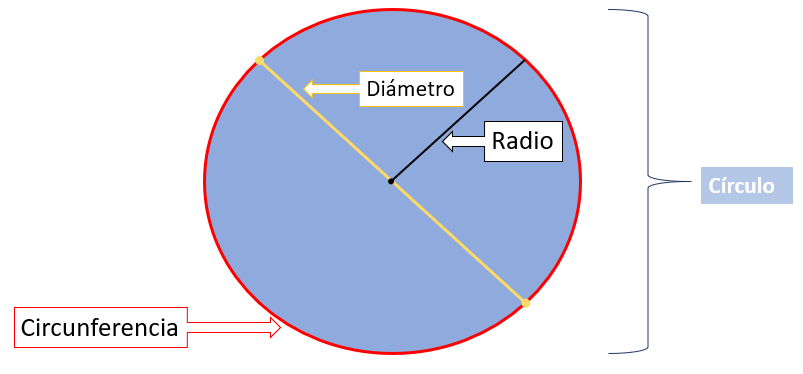 Ya están las cinco palabras, “circunferencia”, “radio”, “diámetro”, “círculo” y “Pi”.
