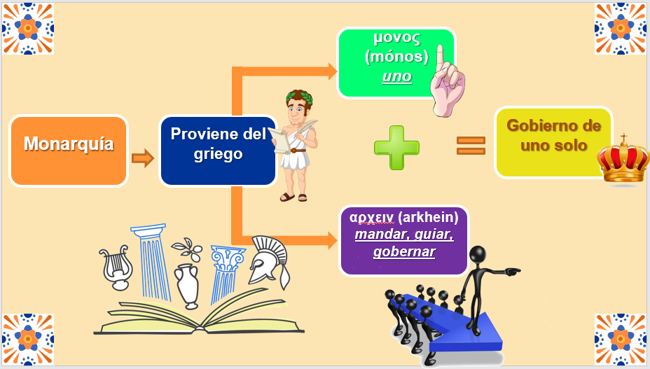 Monarquía significa: “gobierno de uno solo”, es decir, gobierno en el que manda un rey o monarca.