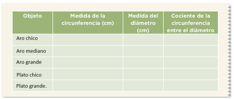 En la segunda columna dice: “Medida de la circunferencia”. Para obtenerla necesitas el listón o estambre y un metro o regla dependiendo del tamaño de los objetos.