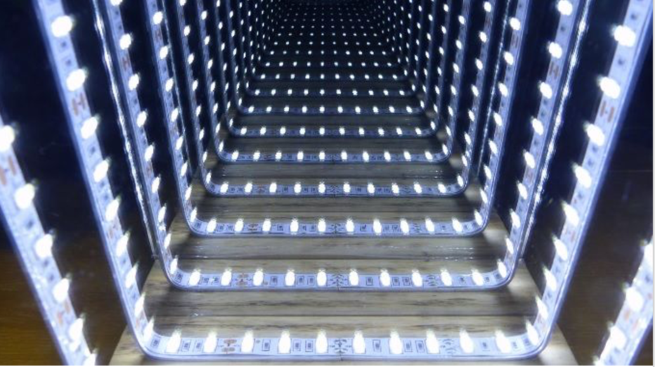 Es un espejo infinito. Parece un túnel de luces, se construye con un espejo real y con mica con una lámina espejada, cuando se encienden las luces LED, el efecto es de dos espejos enfrentados, que se refleja infinidad de veces.