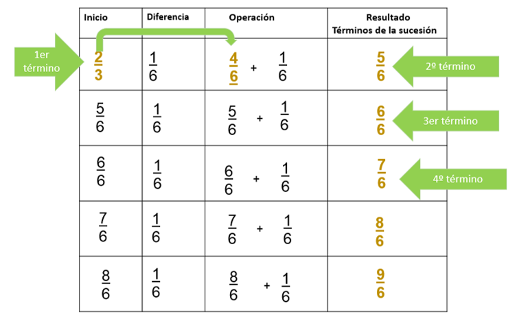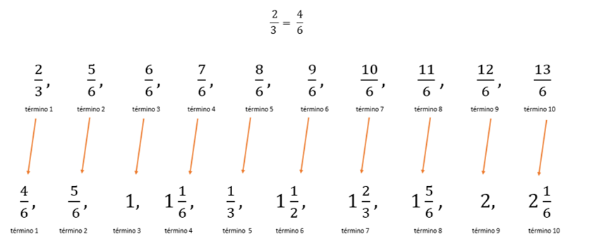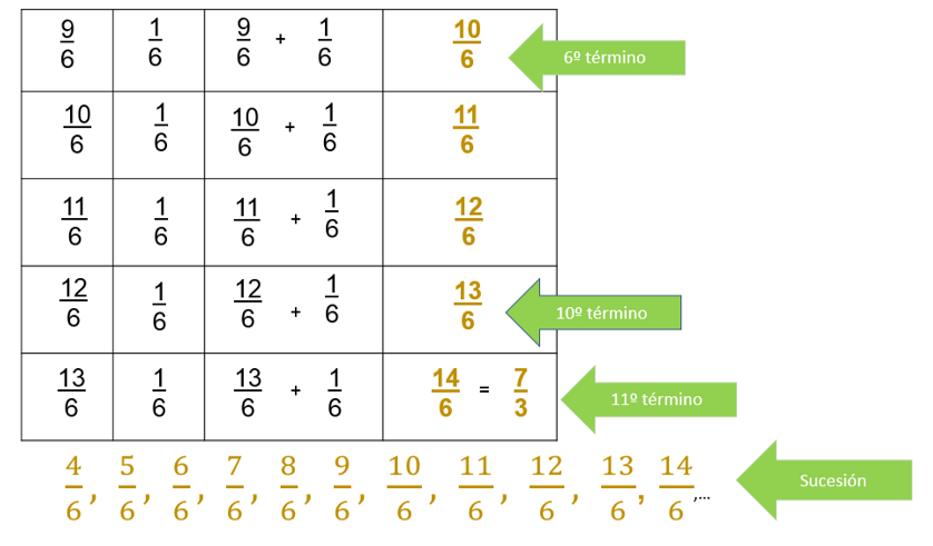 La regla es que la diferencia de un término a otro es un sexto, es decir, aumenta un sexto entre el término anterior y el siguiente. Y la sucesión comienza con dos tercios.