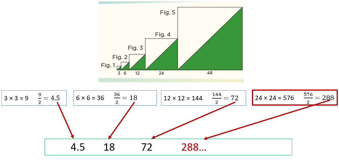 Indican que el primer cuadrado mide de lado 3 unidades, el segundo mide 6 el siguiente 12 el que sigue, 24 el otro mide 48 así que los 5 siguientes serán 96, 192, 384, 768 y 1536