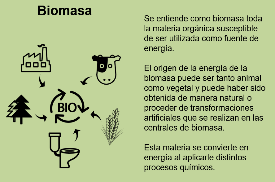 Todavía otra fuente de energía renovable, que es importante mencionar, esta fue la fuente energética más importante para la humanidad hasta el inicio de la revolución industrial, cuando quedó relegada a un segundo lugar por el uso masivo de combustibles fósiles, se trata de la biomasa.