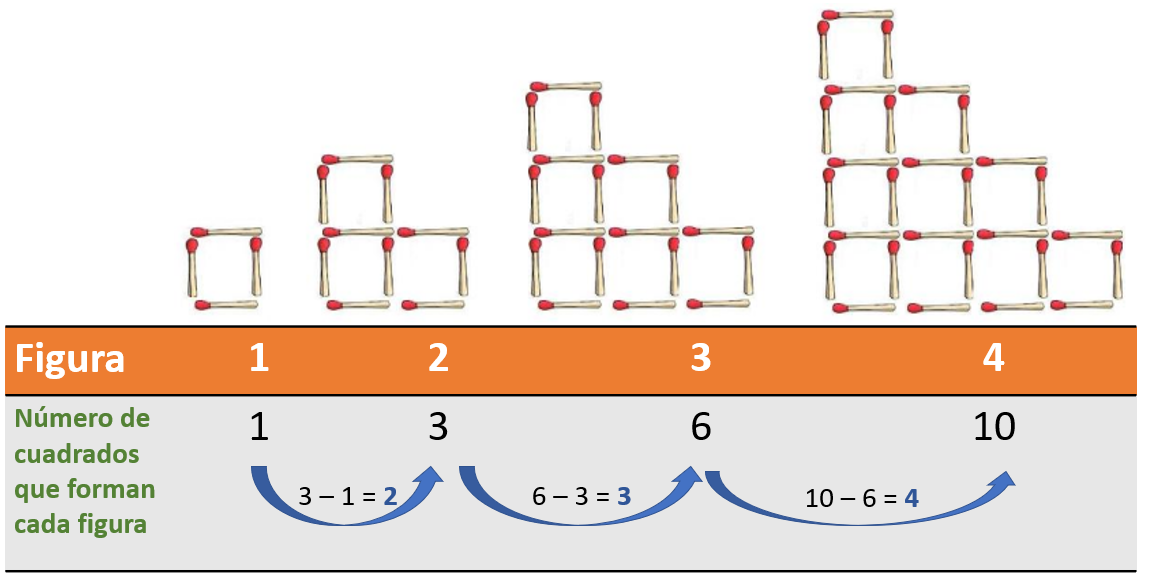 Se trata de la sucesión de figuras que construiste con los cerillos. Ten presente que, en ese caso, a partir de la sucesión de figuras formadas con cerillos se genera la sucesión del número de cerillos que se añaden para formar cada figura y la sucesión formada a partir del número de cuadrados que hay en cada figura.