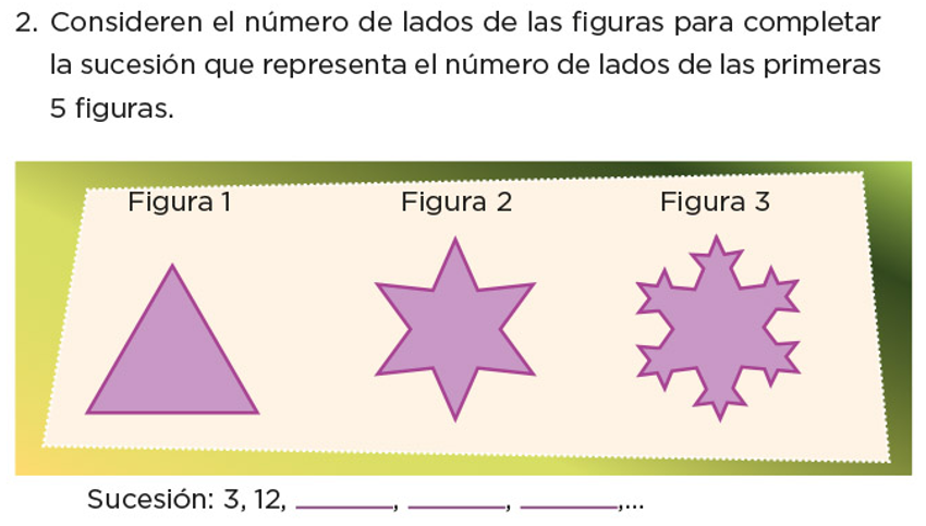 Para ello indica que la referencia es el número de lados que tiene cada figura. ¿Encontraste cuál es el patrón aquí? Cuenta los lados que forman la figura 3 y comprueba tu hipótesis de que para encontrar la siguiente figura, se multiplica por 4 el número de lados de la anterior, entonces, ¿Cómo queda esta sucesión? Los primeros 5 términos serían: 3, 12, 48, 192, 768