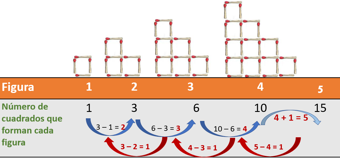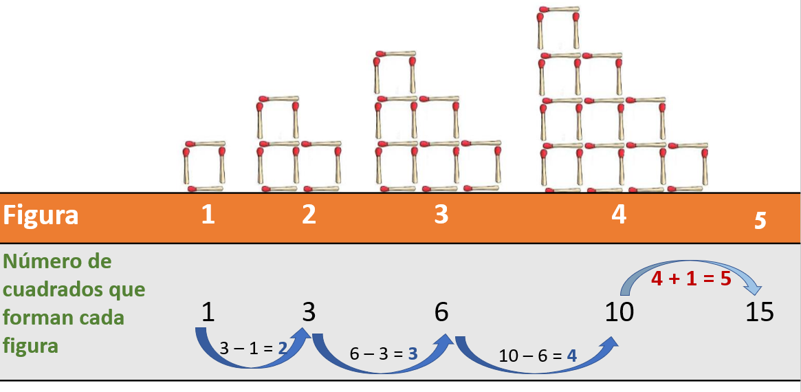 Que de la figura 1 a la 2 se aumentaron 2 cuadrados, luego de la 2 a la 3 se aumentaron 3 cuadrados y de la 3 a la 4 se aumentaron 4 cuadrados, así que de la figura 4 a la 5 se deberán aumentar 5 cuadrados, por lo tanto, esa figura tendrá 15 cuadrados.