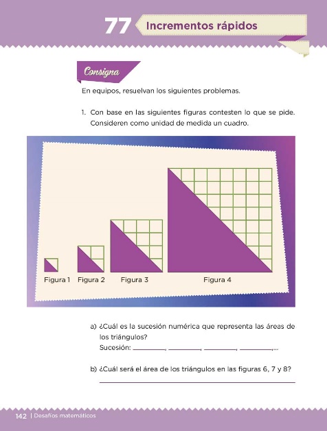 Ahora deja esta sucesión aquí como un ejemplo de sucesiones que no son aritméticas ni geométricas y ve a tu libro de desafíos matemáticos donde analizarás las sucesiones que aparecen en la página 142 en el desafío 77 llamado ¡Incrementos rápidos!