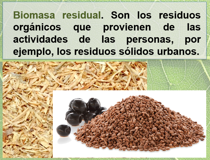 - Biomasa residual. Son los residuos orgánicos que provienen de las actividades de las personas, por ejemplo, residuos sólidos urbanos.